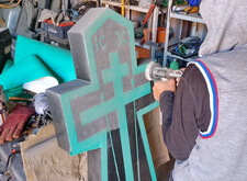 Изготовленную стелу готовим к пескострую. Закрываем плёнкой части, которые должны остаться полированными. Прочую площадь делаем матовой.