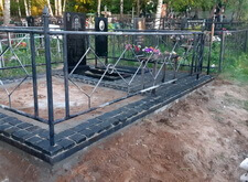 Уложив периметр, мы застелили территорию места захоронения геотекстилем, и выложили брусчатку вокруг памятников, предварительно установив лавочку со столиком.